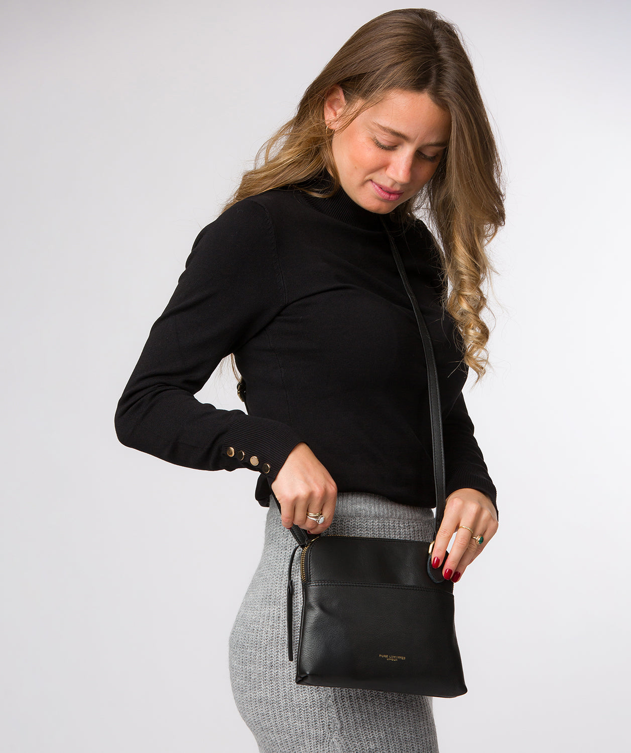 - The Pure Luxuries logo is embossed in gold foil on the front of the bag and the bag charm for a beautifully simple and sophisticated finishing touch