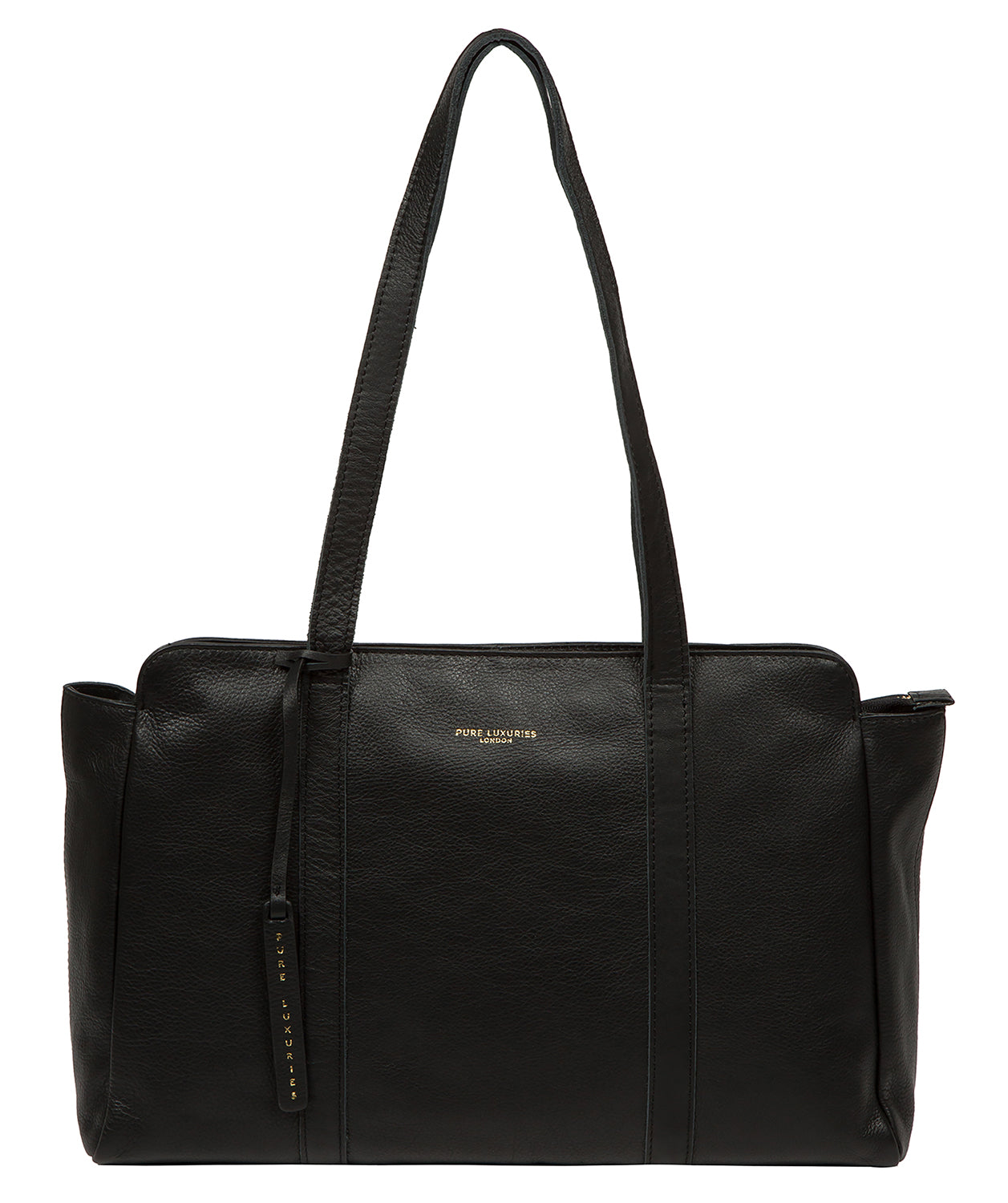- The Pure Luxuries logo is embossed in gold foil on the front of the bag and the bag charm for a beautifully simple and sophisticated finishing touch
