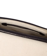 - A mock-buckle design conceals a magnetic clasp closing which secures an external pocket and the 100% cotton-lined central compartment