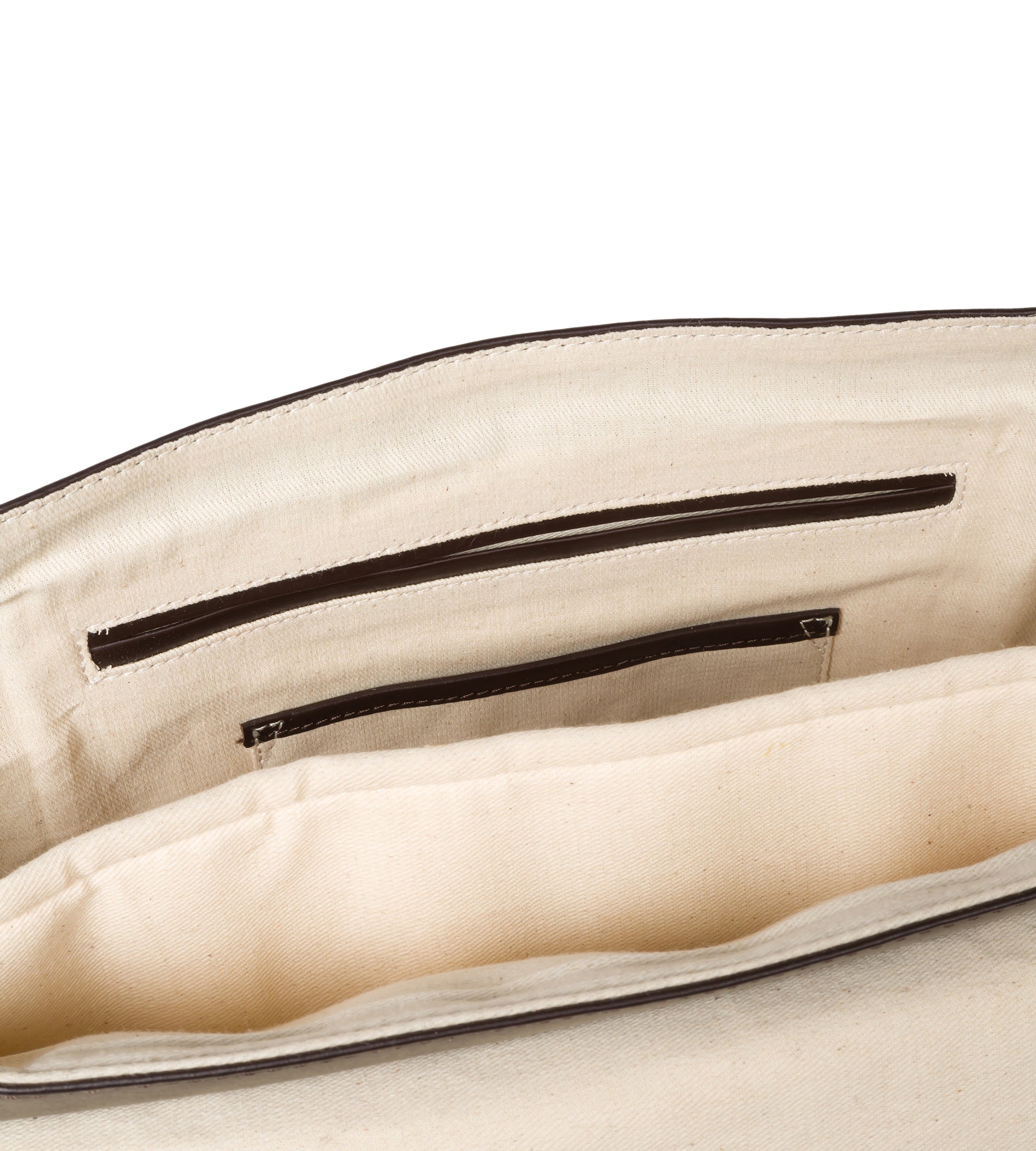 - Contemporary click-in buckles secure a top flap, two front slip pouches and a central compartment