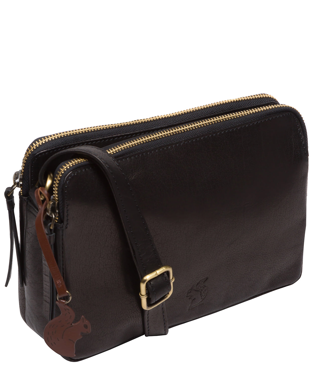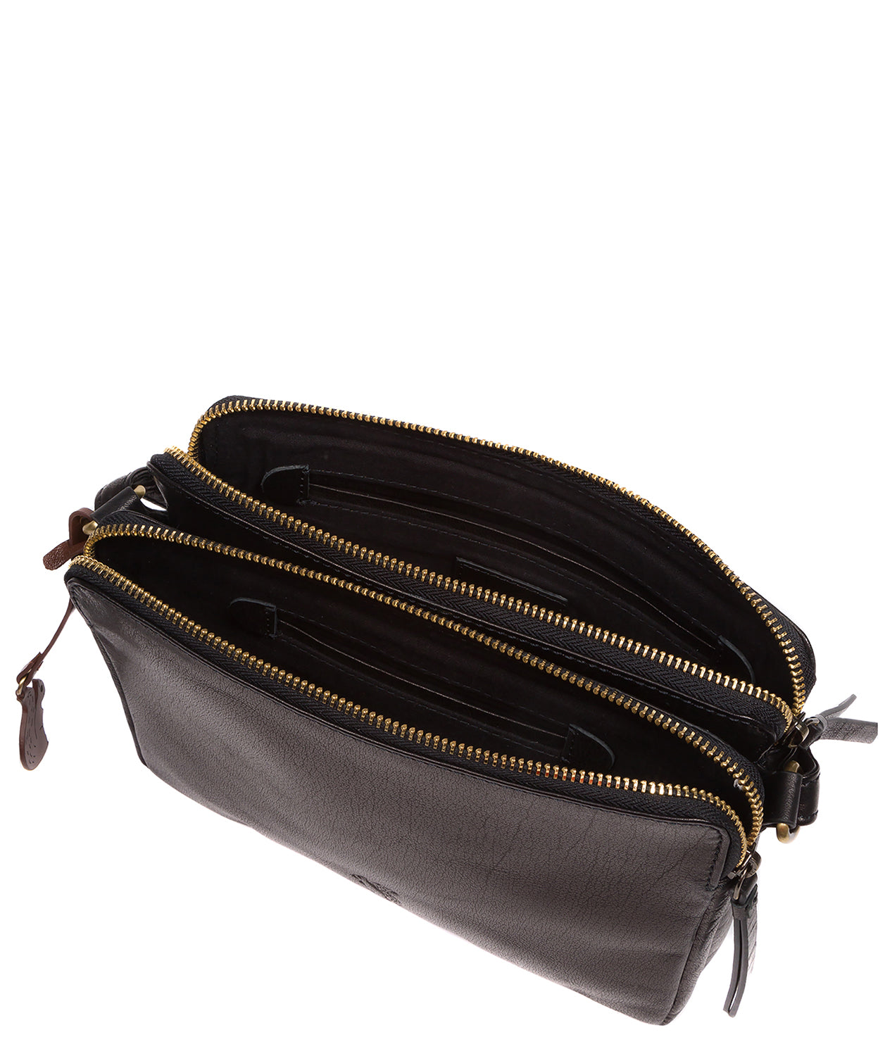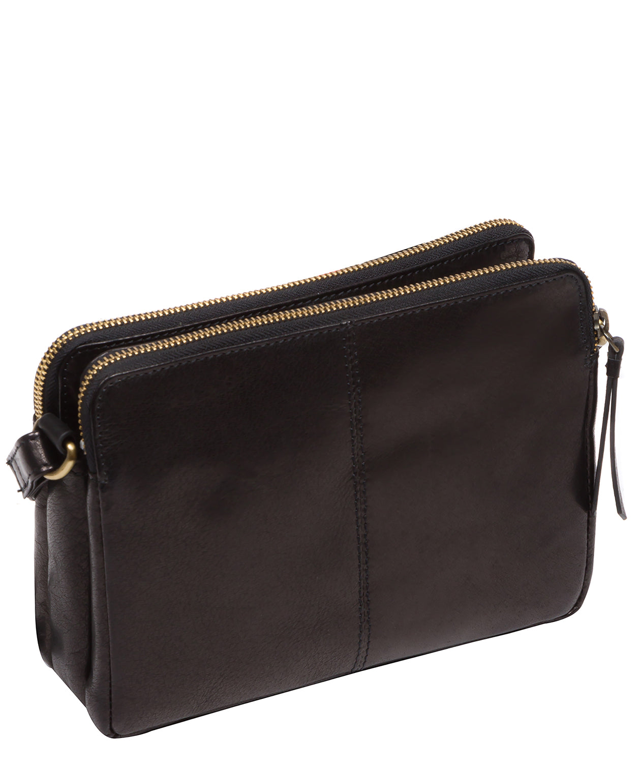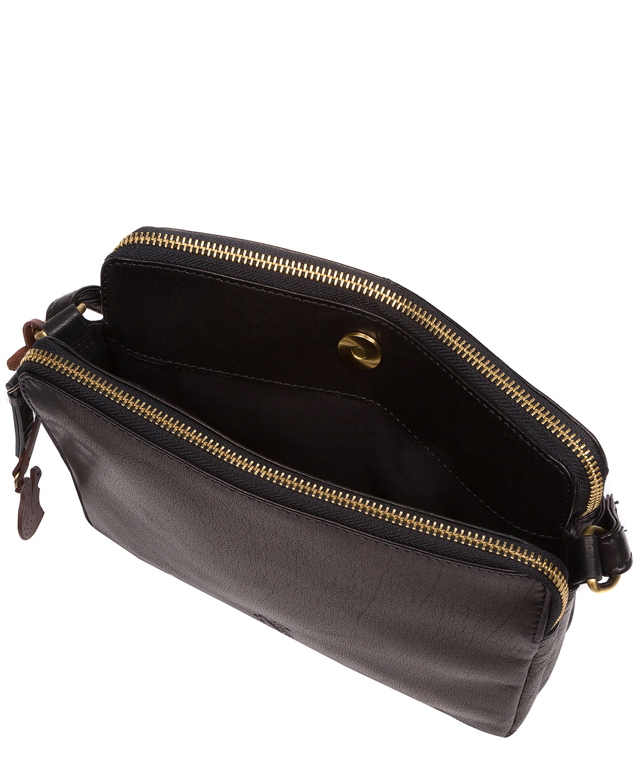- Adorned with an adjustable slim leather strap with a maximum drop length of 65cm and features eye-catching rustic brass metal fittings and zips