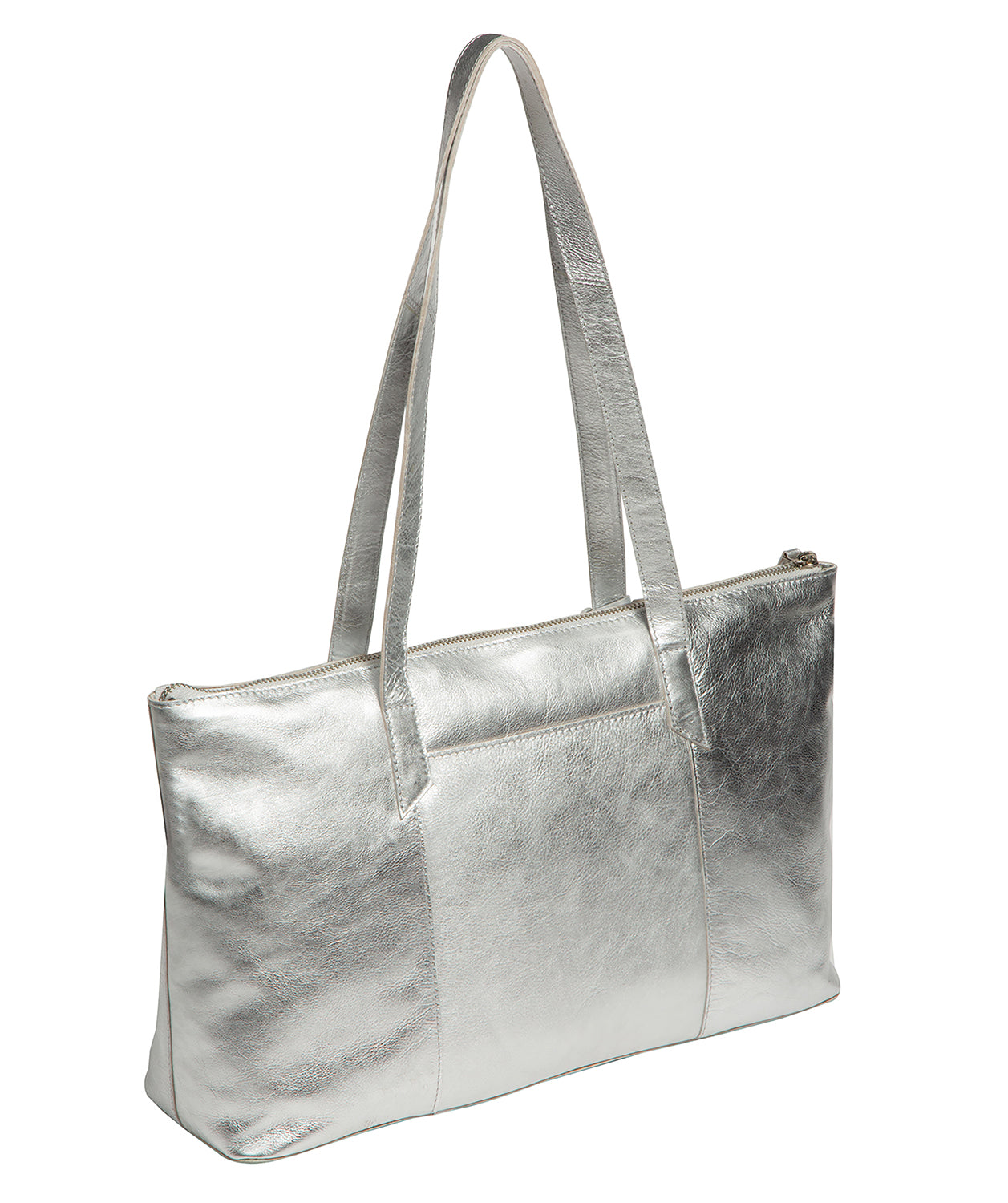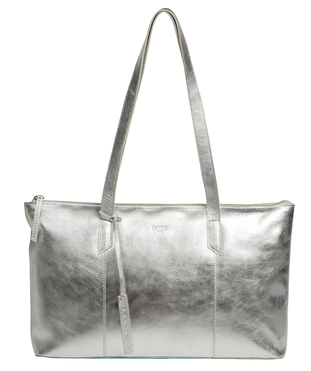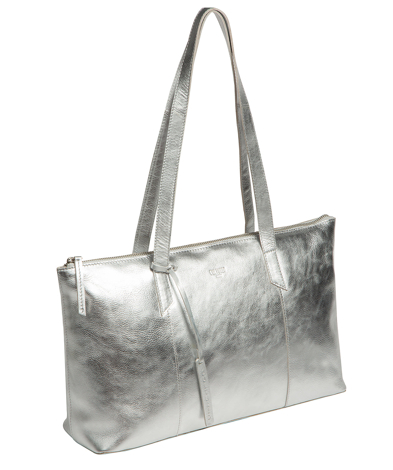 - Slim leather handles adorns this style with a drop length of 25cm and is complemented by eye-catching silver fittings and zips