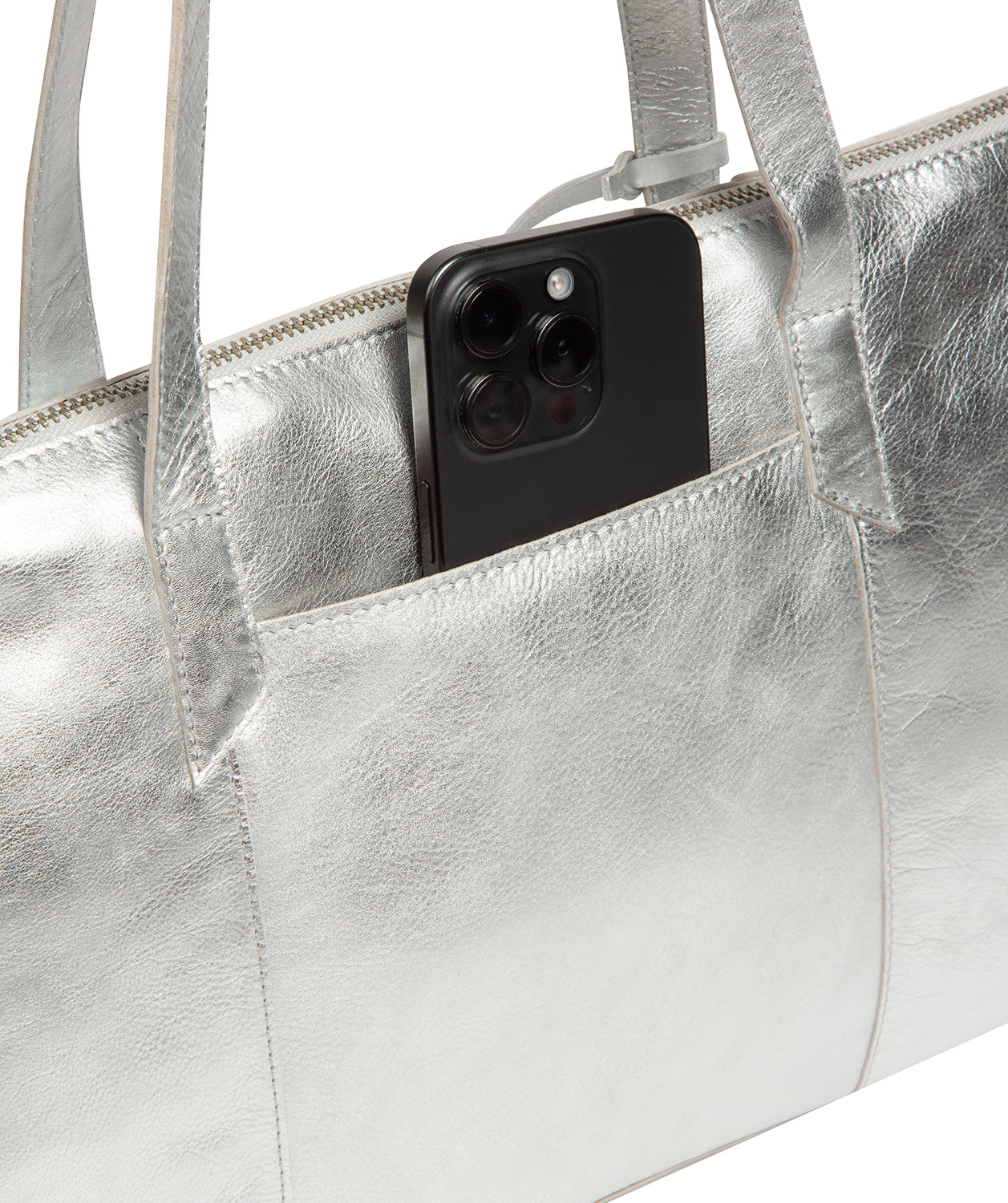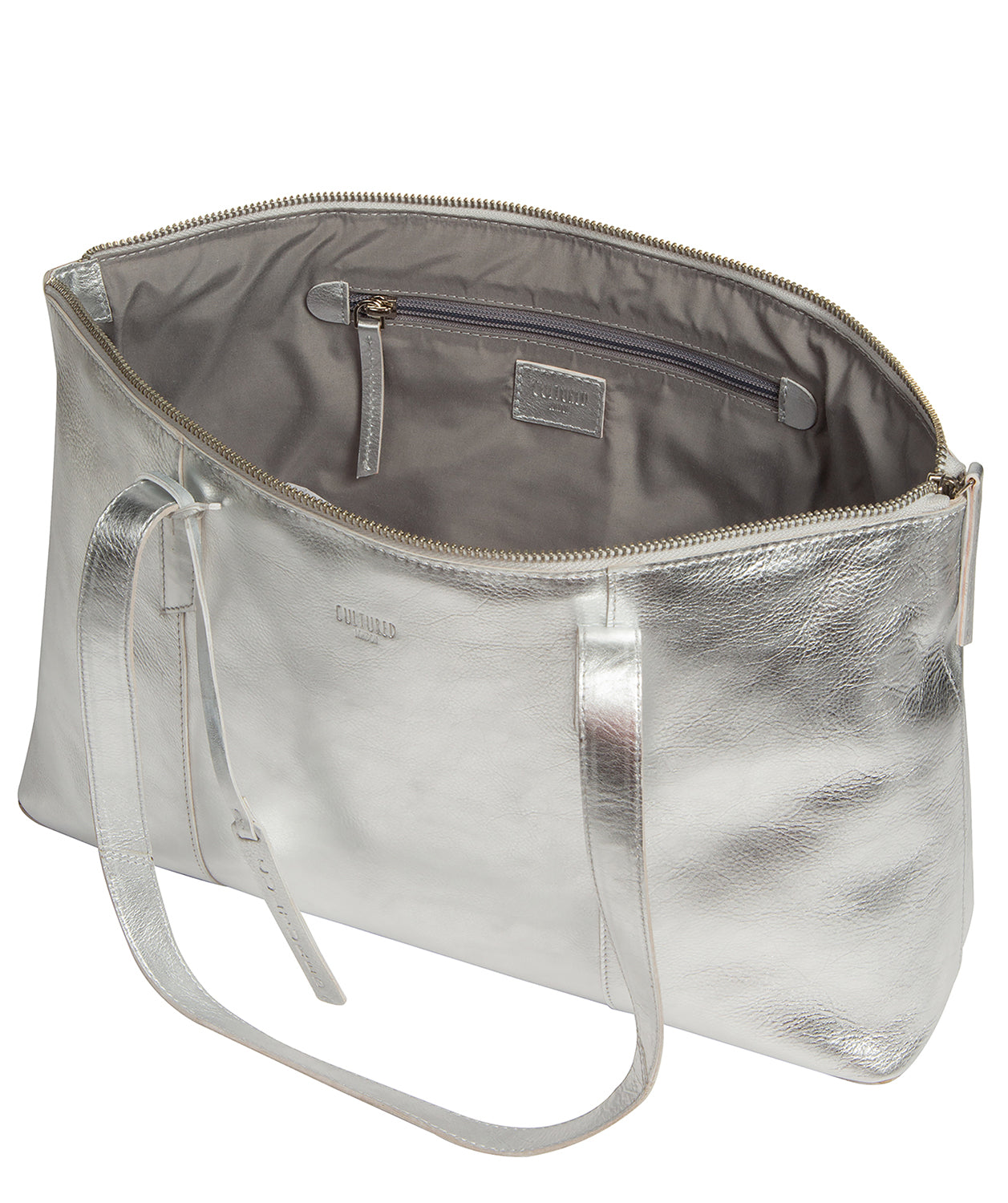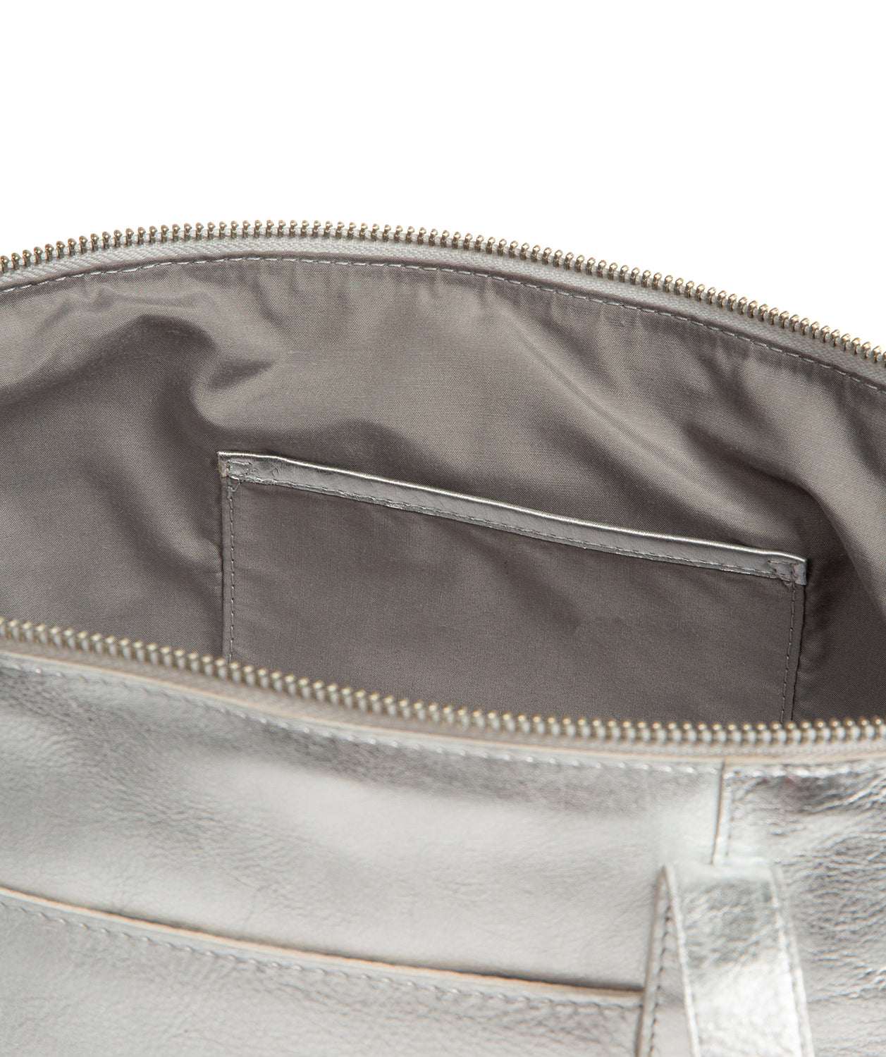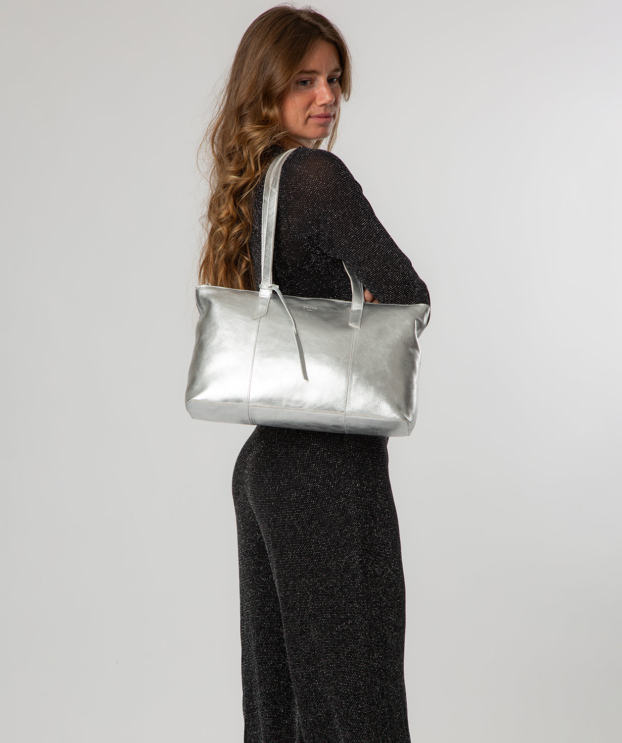 - Slim leather handles adorns this style with a drop length of 25cm and is complemented by eye-catching silver fittings and zips