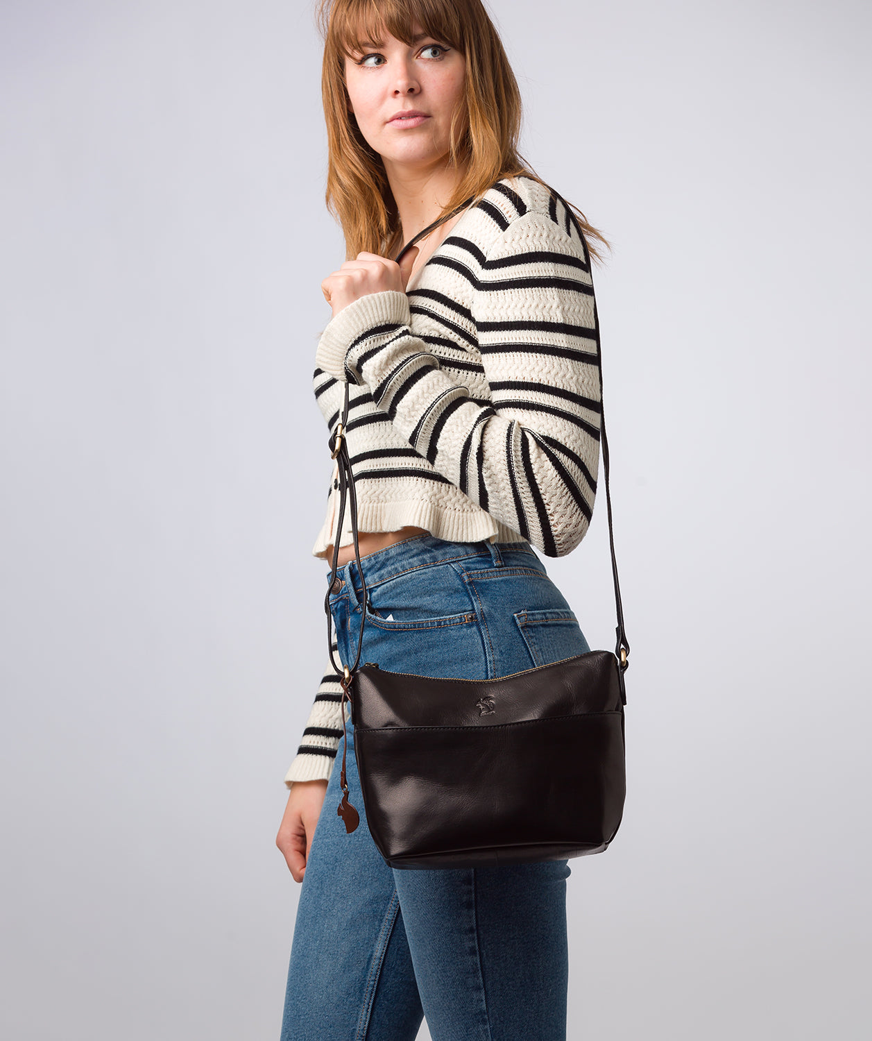 - Eye-catching gold metal fittings and zips adorn the bag alongside the adjustable slim leather strap with a drop length of 70cm