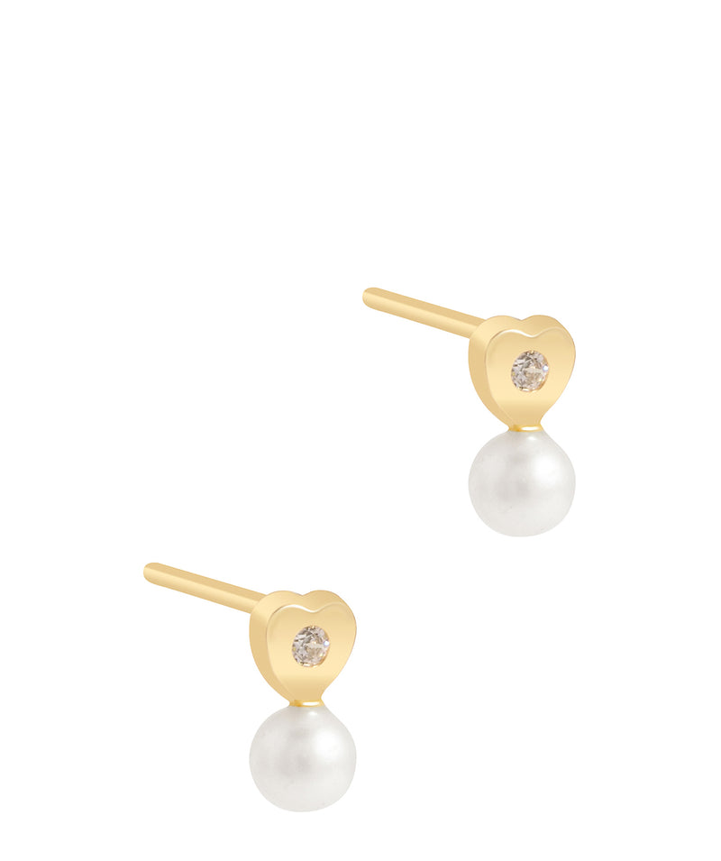 - A beautiful cubic zirconia is set in a yellow gold heart which is then finished with a pearl which hangs perfectly from the earring