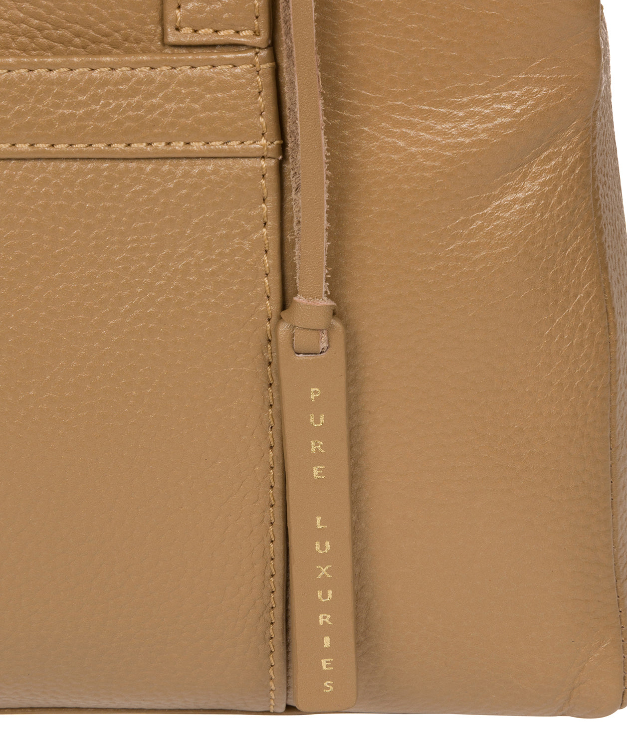 - Matching leather handles are the perfect length for slinging over your arm or over your shoulders