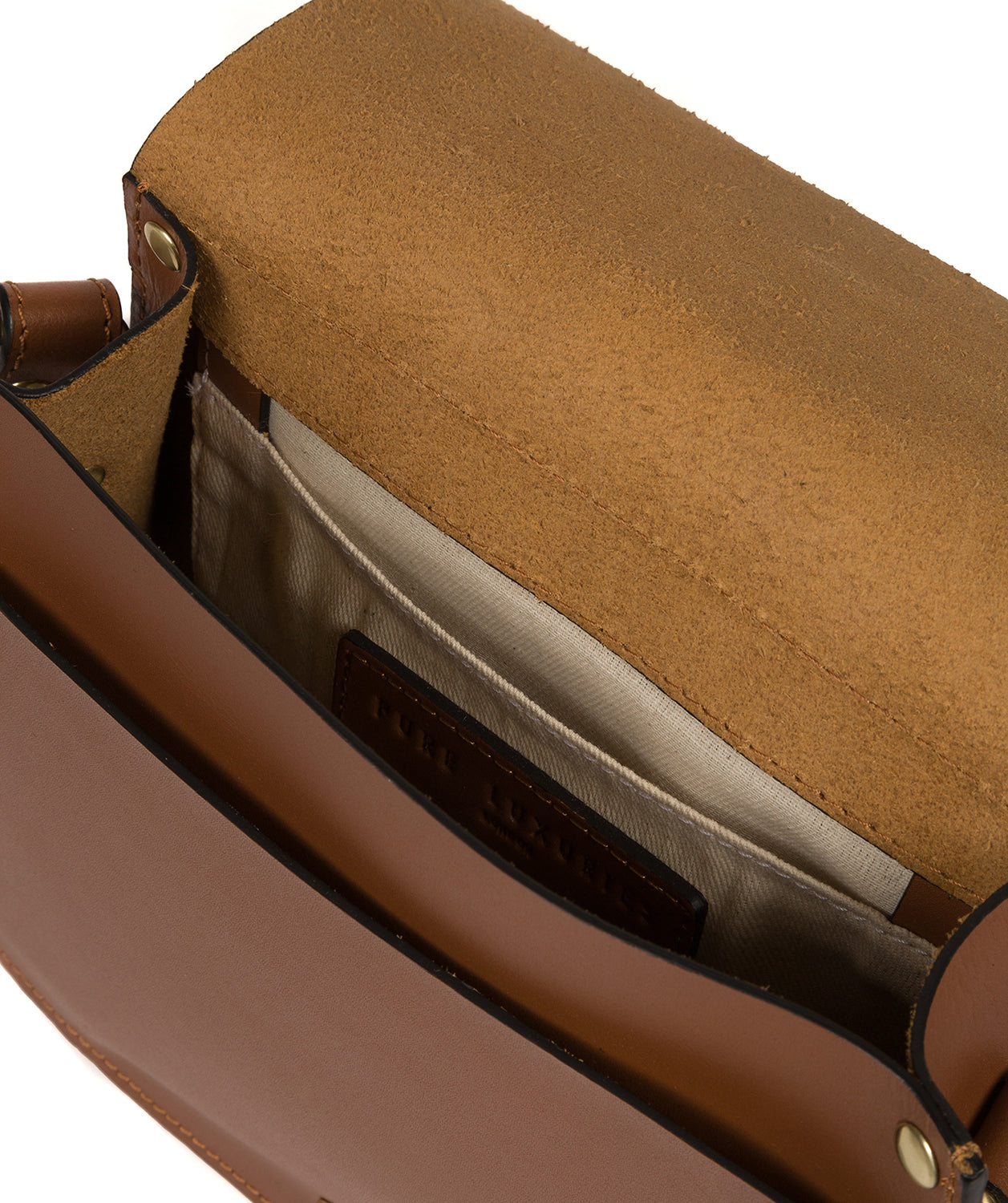 - The distinctly shaped bag comes with a fold-over top which conceals a beautiful supple exposed natural leather beneath