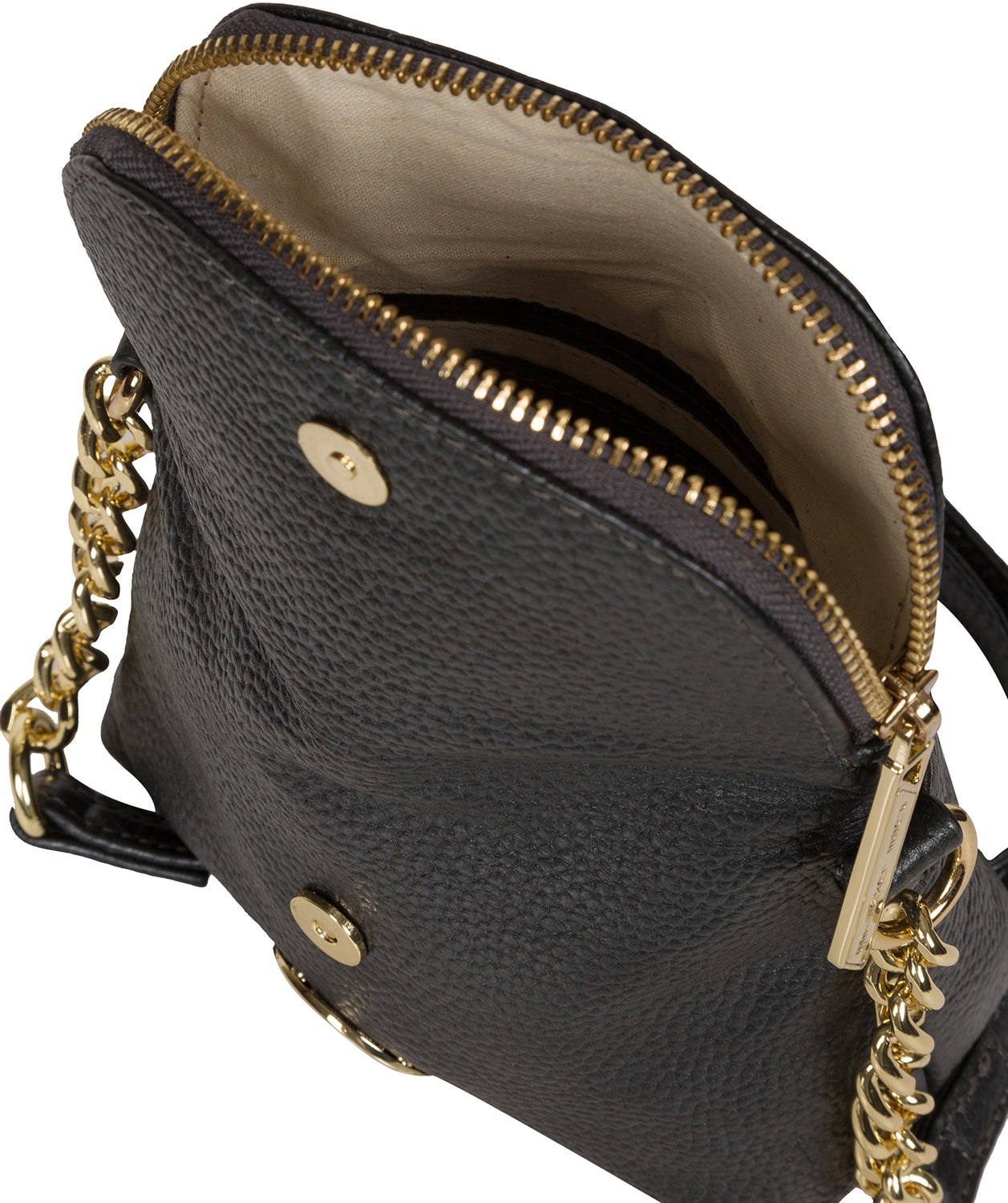 - A fold-over flap secured by a magnetic press-stud conceals the central compartment which comes lined with 100% untreated natural cotton lining underneath a zip-over top