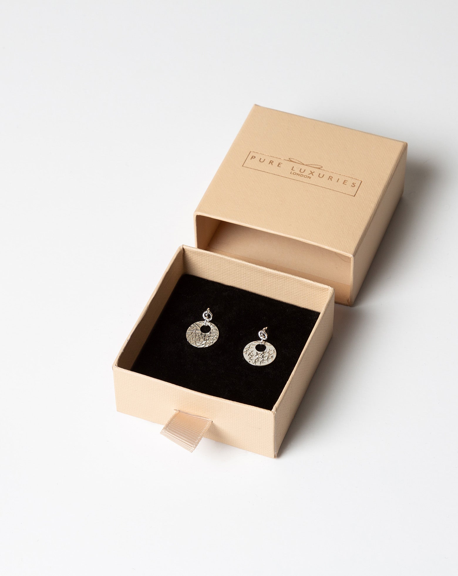 Gift Packaged 'Polyhynia' Sterling Silver Diamond Cut Flat Disc Drop Earrings