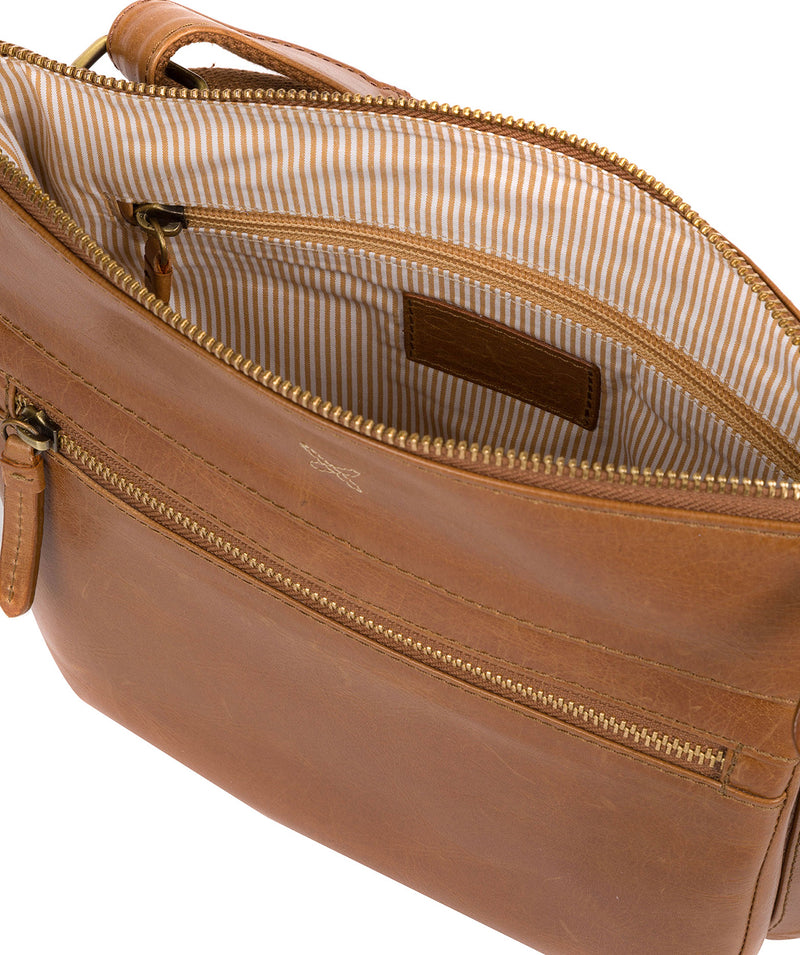 - A zip over top secures a spacious central compartment with a pinstripe lining