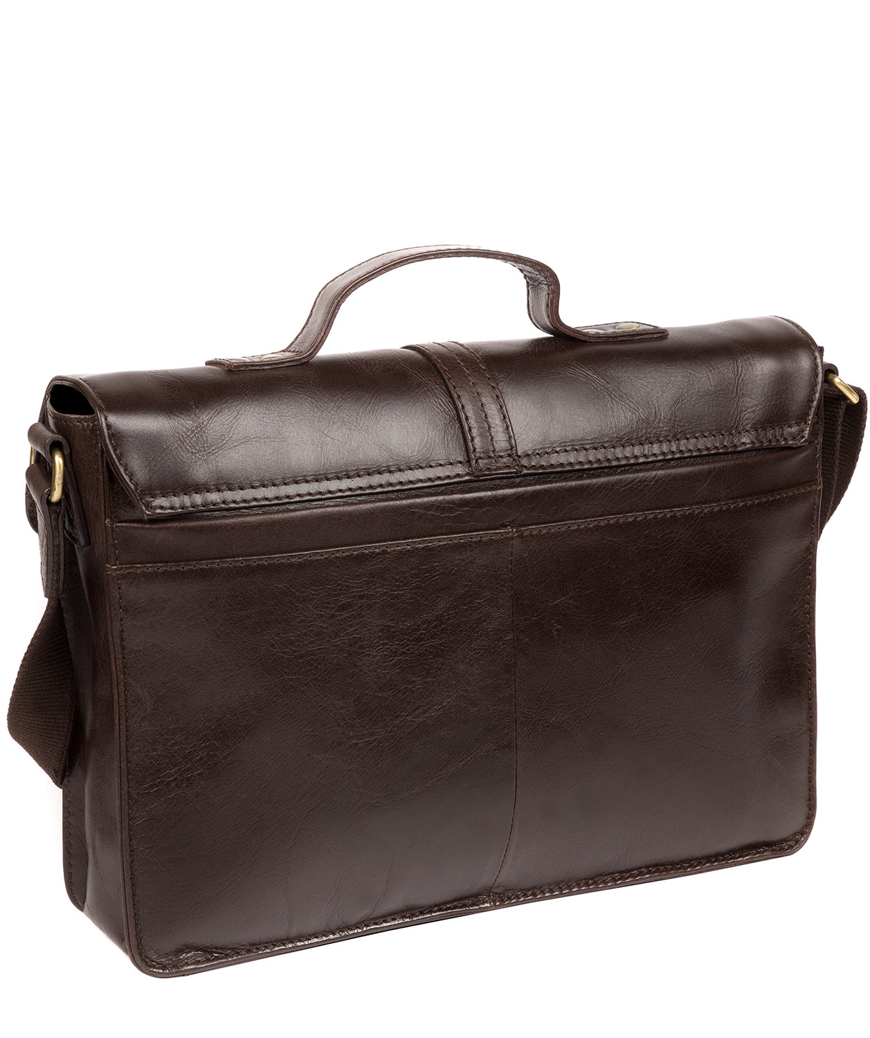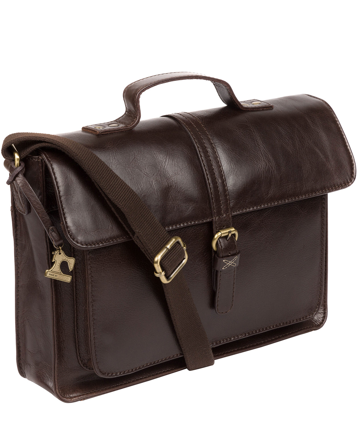 - A fold over top secures a spacious central compartment with a pinstripe lining thanks to a buckle fastener